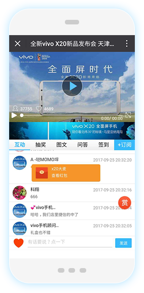 支持直播群聊、图文报道、点播评论、问答签到、红包打赏。