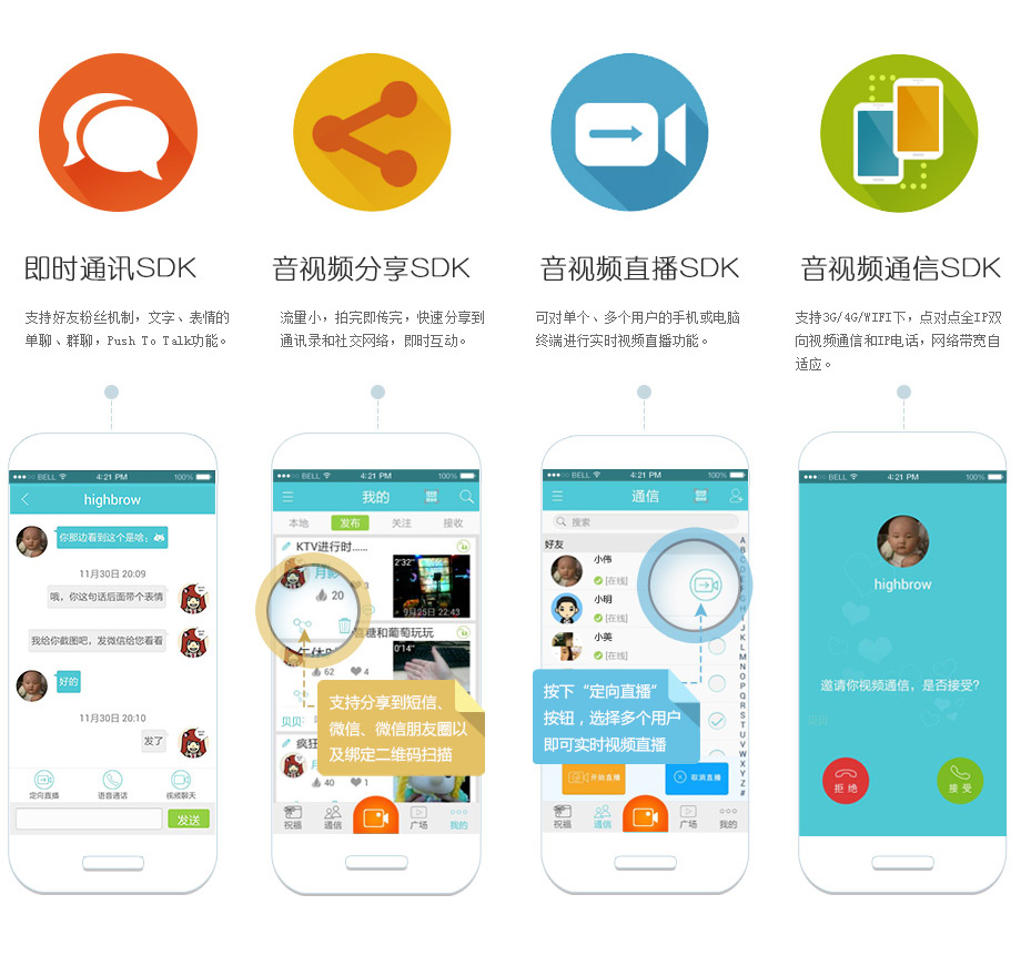 向手机通讯录多个好友定向直播和推送视频;向微信群组和朋友圈现场直播视频;在微信和微特喜 直播大厅网页端 实时观看;支持公开、圈子、私有方式的视频直播。